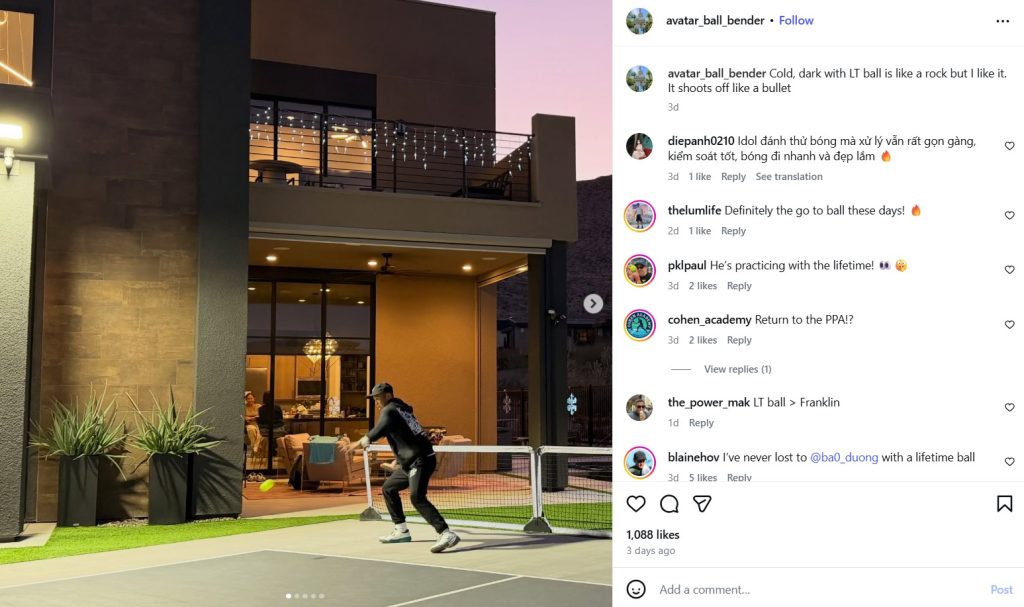 Trên trang cá nhân, Navratil chỉ ra rằng Quang Dương gần đây đã đăng tải hình ảnh tập luyện với loại bóng Lifetime, vốn là bóng thi đấu chính thức của PPA Tour. “Tôi đã phát hiện điều khá thú vị trên trang cá nhân của Quang Dương, anh ấy tập luyện với loại bóng mà chỉ có các giải đấu của PPA Tour sử dụng”, Navratil nhận xét.