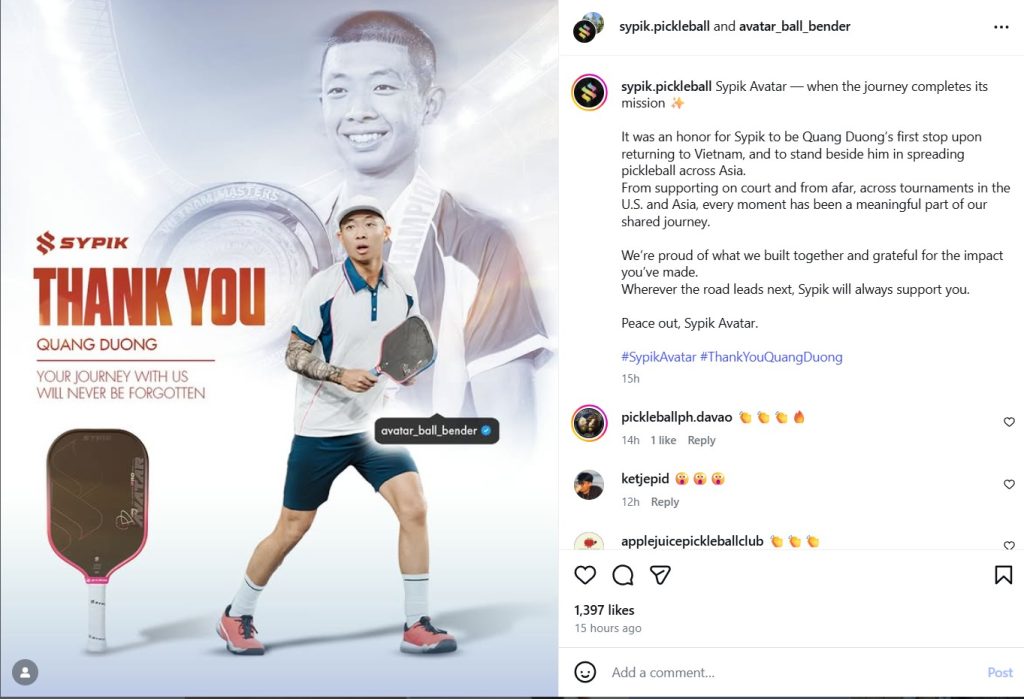Một chi tiết khác cũng được giới quan sát đặc biệt chú ý là phản ứng từ phía ban tổ chức. Connor Pardoe, người sáng lập PPA Tour, đã trực tiếp “thả tim” bài đăng tập luyện của Quang Dương. Động thái tưởng chừng nhỏ này lại mang nhiều ý nghĩa trong bối cảnh hai bên từng rạn nứt hồi tháng 7 năm 2024, khi Quang Dương rời liên minh UPA để tham gia các sự kiện quốc tế.