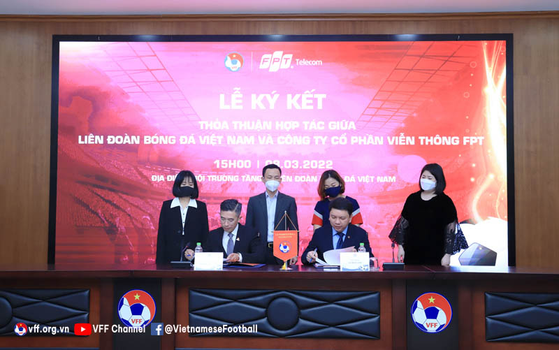 Tham dự lễ ký kết hợp tác có ông Lê Hoài Anh – Tổng Thư ký Liên đoàn Bóng đá Việt Nam (VFF) và ông Hoàng Việt Anh – Tổng Giám đốc FPT Telecom.